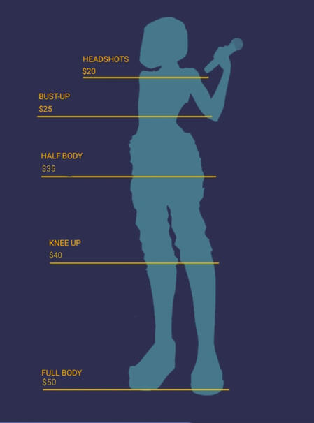 Complex background starts at: $15EXTRA CHARACTER:Headshots: $15+